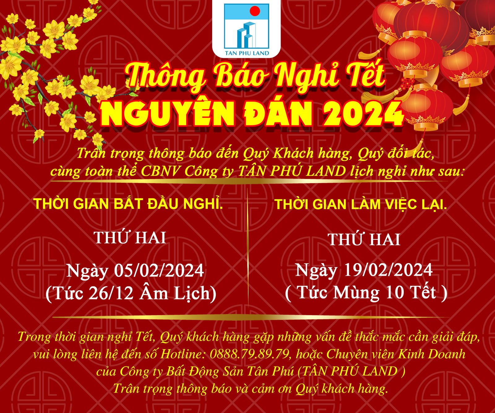 Cảm ơn Quý Khách Hàng đã luôn quan tâm, tin tưởng, ủng hộ đến sản phẩm và dịch vụ của công ty. Đặc biệt cảm ơn đến các Anh/Chị/Em trong Chi Nhánh đã gắn bó, đoàn kết, cống hiến để giúp Tân Phú Land vững bền, phát triển. Mong rằng chặng đường sắp tới dù có nhiều khó khăn thì cũng mong mọi người hãy gắn...